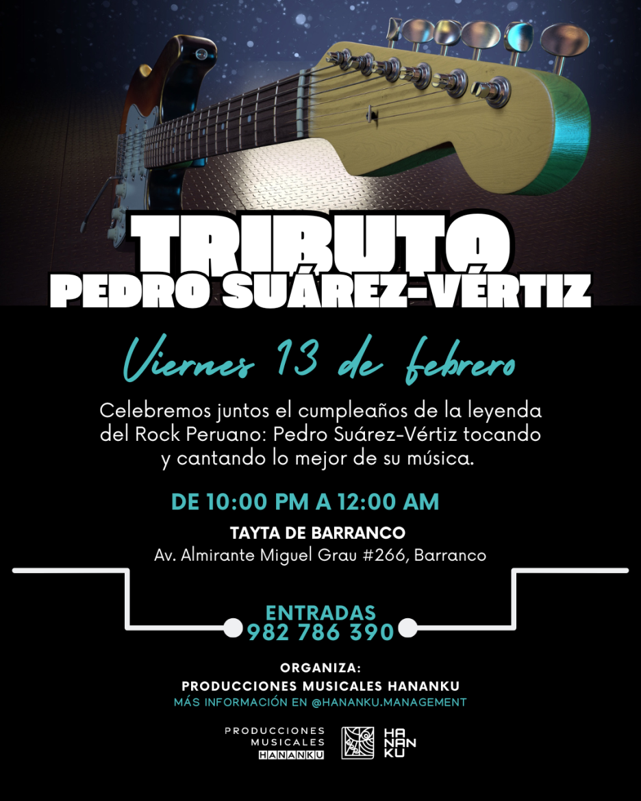 La música de Pedro Suárez-Vértiz volverá a sonar en vivo en el corazón de Barranco durante un show especial programado para el viernes 13 de febrero. El escenario de El Tayta servirá para celebrar el onomástico del cantante mediante un formato de concierto tributo que prioriza la ayuda a los ciudadanos de escasos recursos. La meta principal de esta reunión consiste en abastecer de alimentos a la organización social Sol y Mar ubicada en el distrito de Ventanilla.